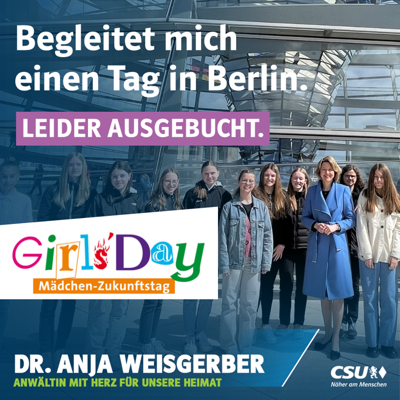 Am Girls'Day lade ich Mädchen aus meinem Wahlkreis Schweinfurt-Kitzingen ein, mich einen Tag bei meiner Arbeit im Bundestag in Berlin zu begleiten und in die Arbeit einer Bundestagsabgeordneten hinein zu schnuppern.