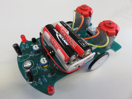 Bringe durch löten und schrauben den batteriebetriebenen Elektromotor zum Laufen, sodass dein kleines Roboterfahrzeug selbstständig einer vorgegebenen Linie folgen kann.