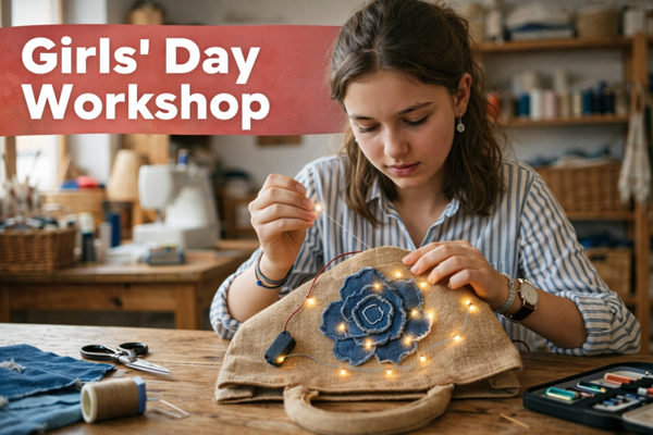 In diesem Workshop wirst du selbst zur Designerin und Entwicklerin: Du gestaltest deine eigene Smart-Tasche, die leuchtet! Mit speziellem Garn, kleinen Bauteilen und Stoffresten lernst du Schritt für Schritt, wie du einen Stromkreis in Stoff einnähst.